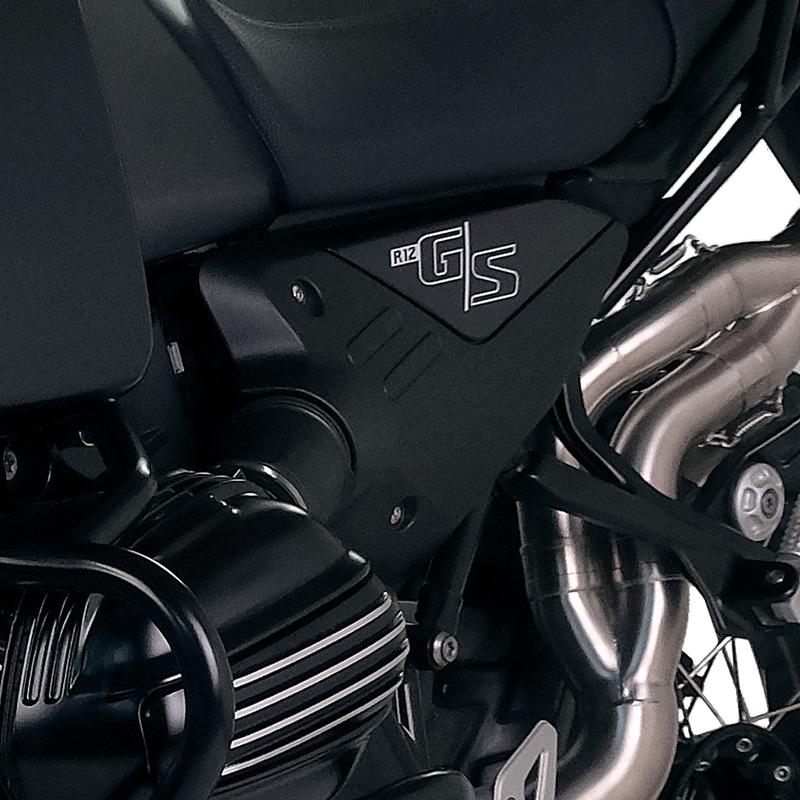 Pair of black protective stickers with G/S logo, protected with special UV-resistant film, ready to be applied to the original side panels of the BMW R12 G/S.