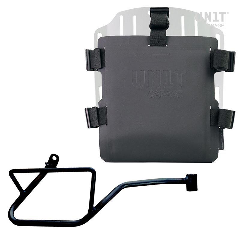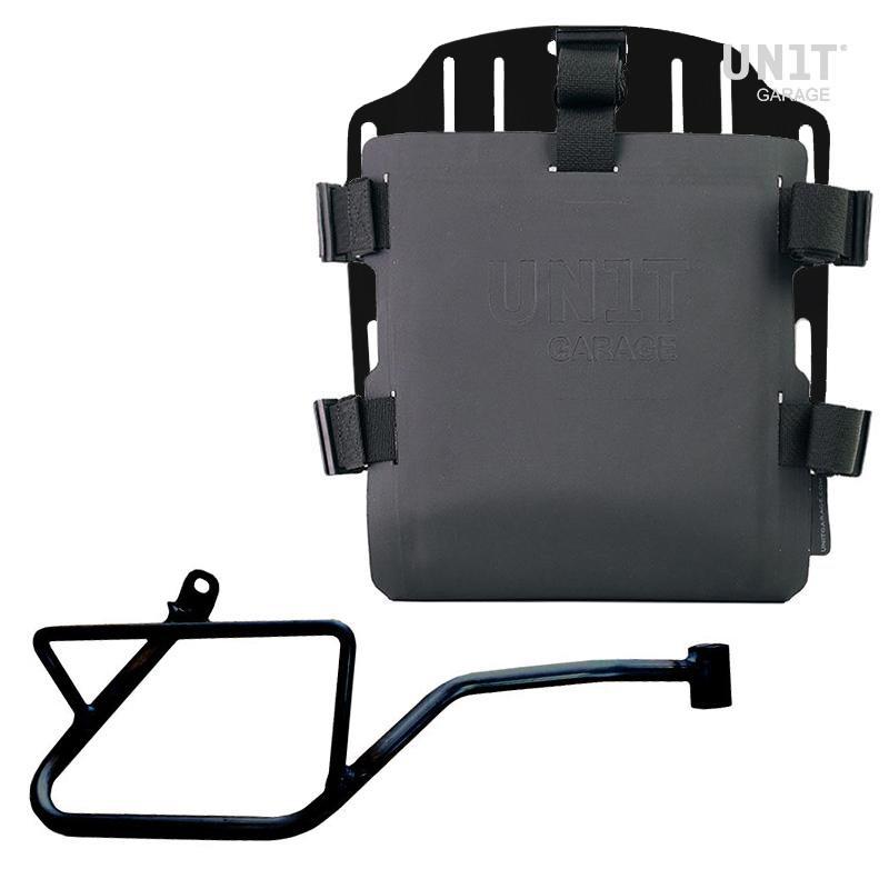 Carrying system in aluminum complete with adjustable Hypalon front. It quickly attaches to our bag holder frames with the quick release system cod.U000 already included and mounted on the back of the plate , which is equipped with a lock for locking on the frame itself. The plate creates a flat mounting surface on the side of the bike, this will allow the transport of unattached bags or other objects, such as sleeping bags, jackets etc. The front flap in Hypalon can be adjusted using the supplied sliders and can be removed very quickly from the plate.