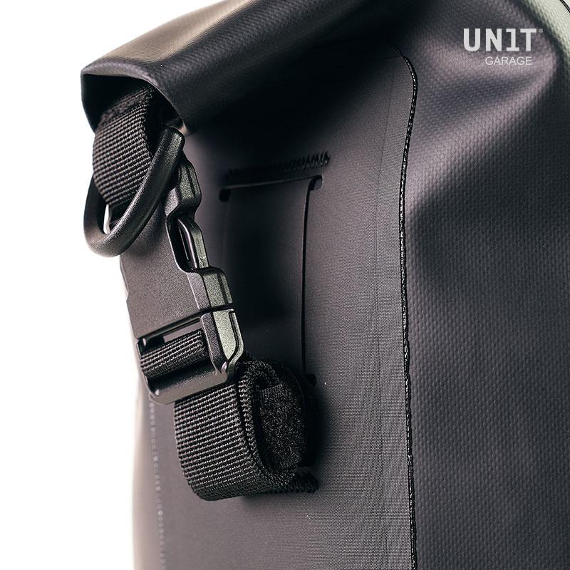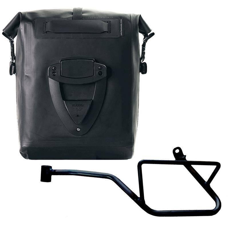 It attaches easily to our sub frame with the quick release system Cod.U000 already installed on the back of the bag. With the included key the quick release system can be closed, locking the bag to the frame. It is big enough to easily fit a 15" laptop, and is equipped with a large waterproof zipped pocket on the front.