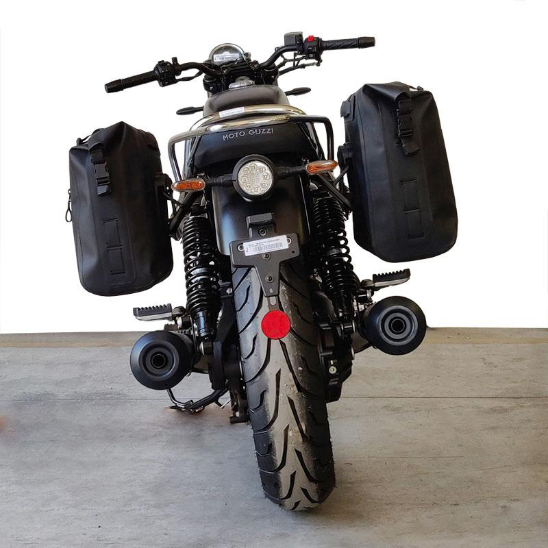 Designed on the Moto Guzzi frame, it integrates perfectly with the rest of the motorbike and is made of steel with a matt black epoxy powder-coated finish. Ready to host our quick release system, beautiful and minimal even when the bag is not mounted. It can be used comfortably with the passenger on board.