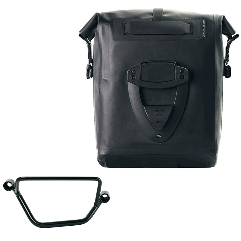It attaches easily to our sub frame with the quick release system Cod.U000 already installed on the back of the bag. With the included key the quick release system can be closed, locking the bag to the frame. It is big enough to easily fit a 15" laptop, and is equipped with a large waterproof zipped pocket on the front.