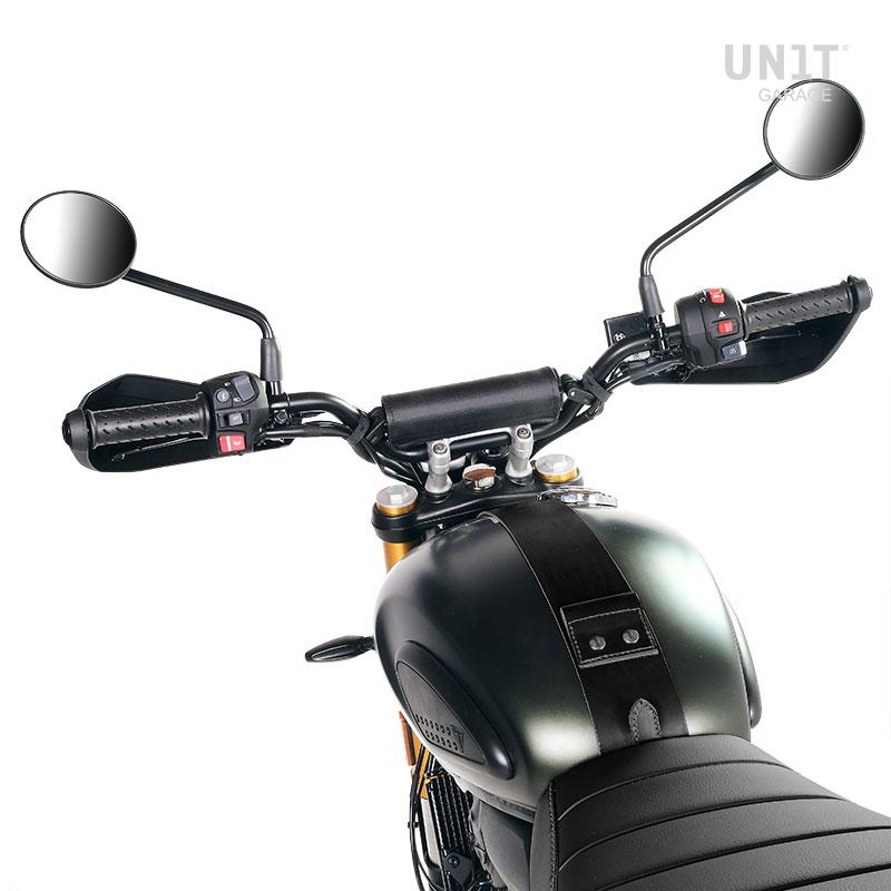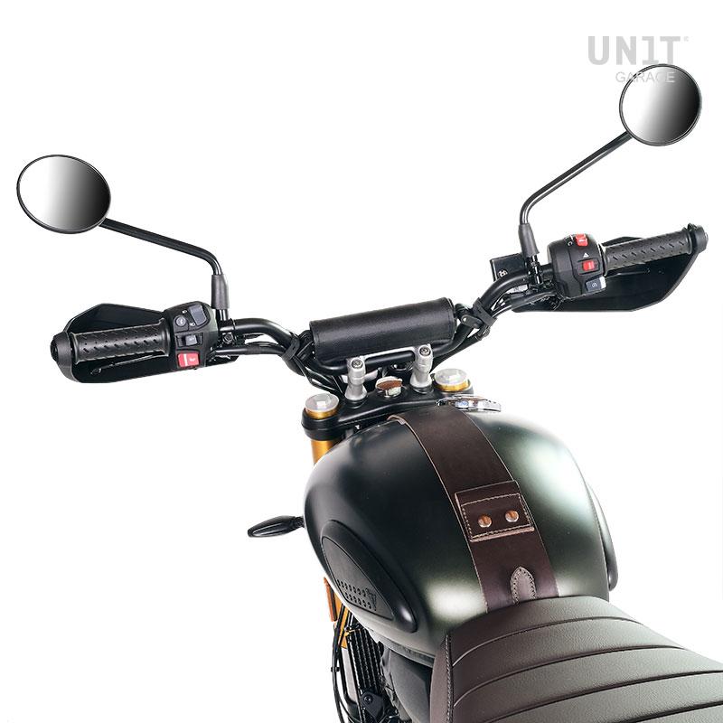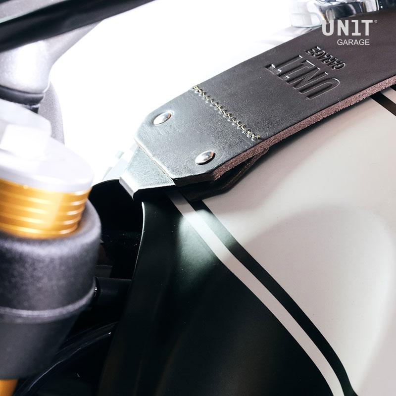 Tank band made of full grain leather and sewn with nylon thread complete with fastening system. Handmade in Italy. It gives the tank a vintage style and allows the mounting of our phone holder Code:1607 or the bag Code:122509_04
