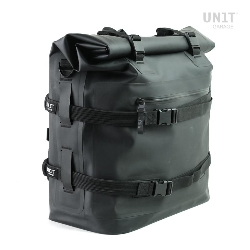 It can also be adjusted to fit most 18mm diameter tube frames on the market, such as the OEM BMW frames. Roll top with a capacity from 35L extendable up to 45L with magnetic buckles for quick opening, a large waterproof zipped pocket on the front and internally; removable reinforced bottom plate. For extreme use we recommend fitting straps horizontally, such as our code UG008 (see photo), hooking them to the aluminium back plate, passing them through the loops on the side of the bags.