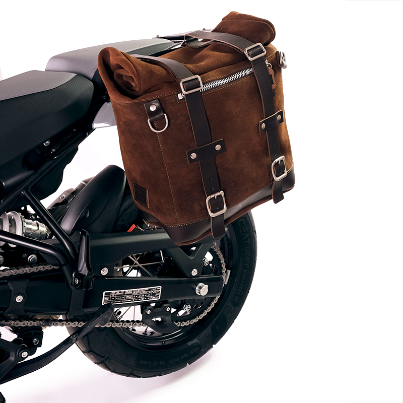 Scram side pannier extendable from 22 to 30 Liters handmade in Italy in sturdy top quality waterproof waxed suede leather.