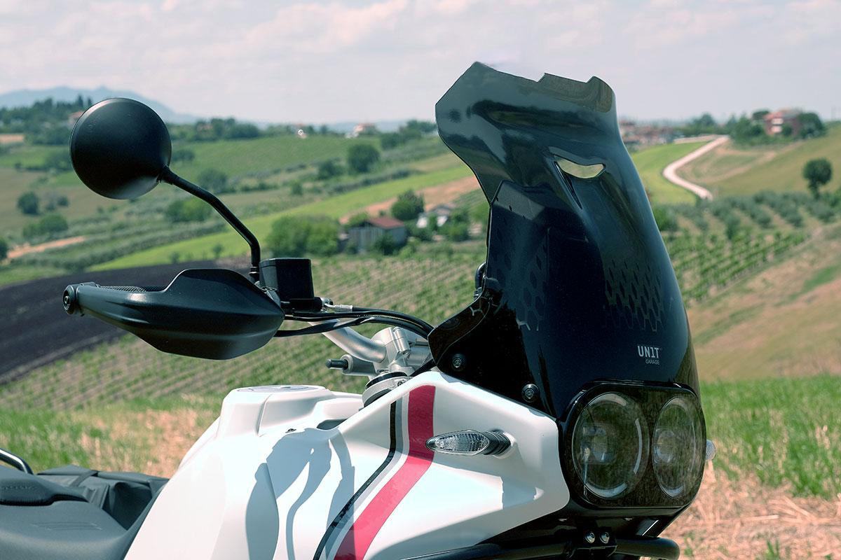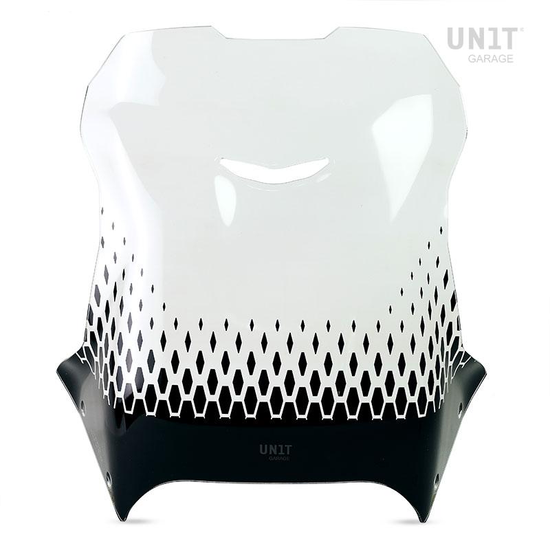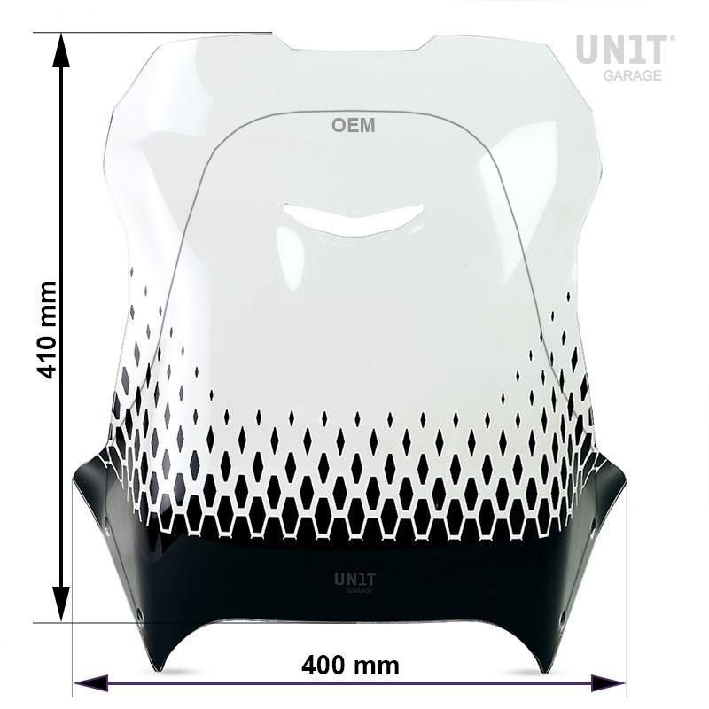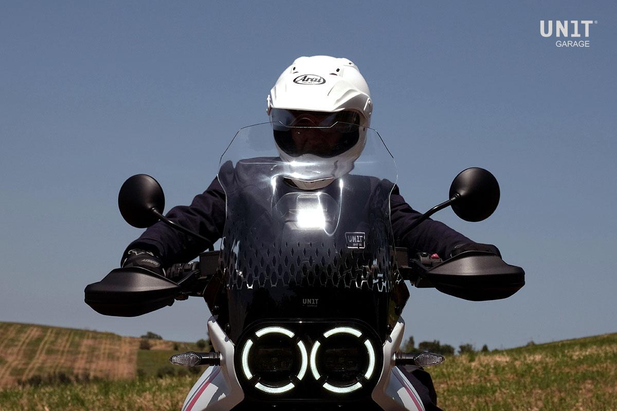 DesertX Edi Touring fairing designed to be mounted without any modification by reusing the original supports. The ergonomics of the fairing is absolutely personal and we have developed it in different shapes, sizes and transparencies, each suitable for different heights and expectations. In this version, the largest and most protective of the three proposals, we have increased the size compared to the original without compromising the design. More protection for those who want to face long journeys and with the addition of a central air intake that directs the air flow in a more controlled way. Trying is believing, the result is fantastic both in terms of design and comfort! Made of 4mm thick PMMA, it is available both transparent and smoked, both with screen printing.