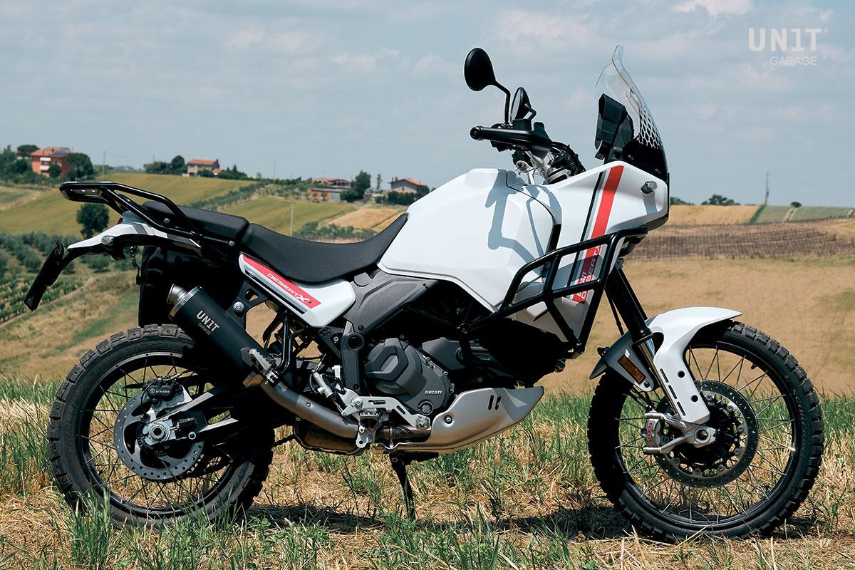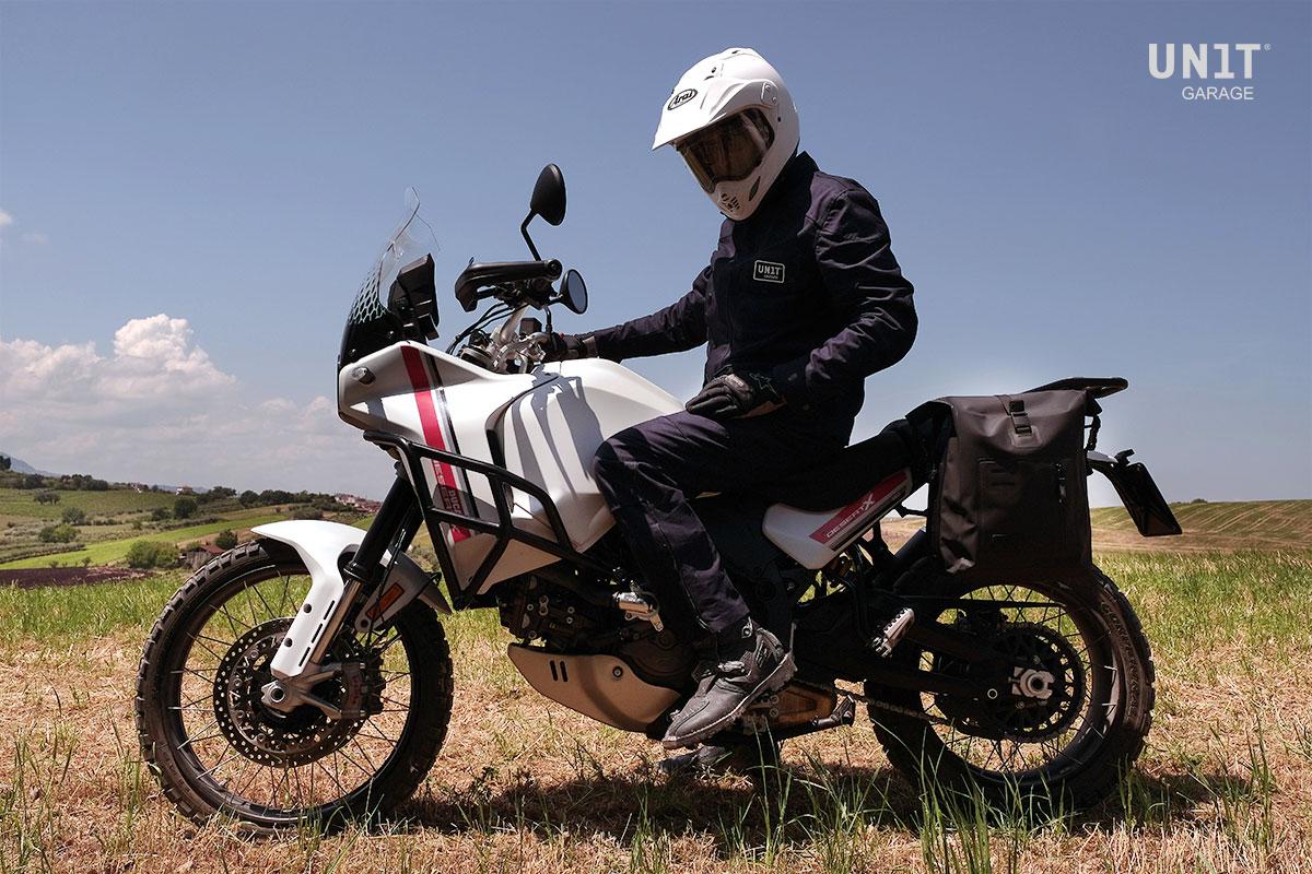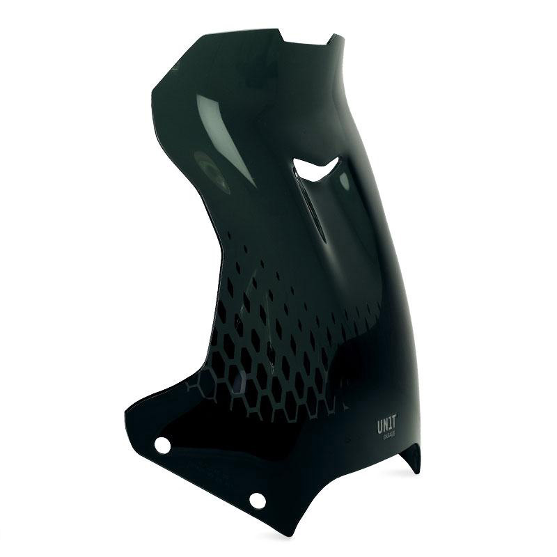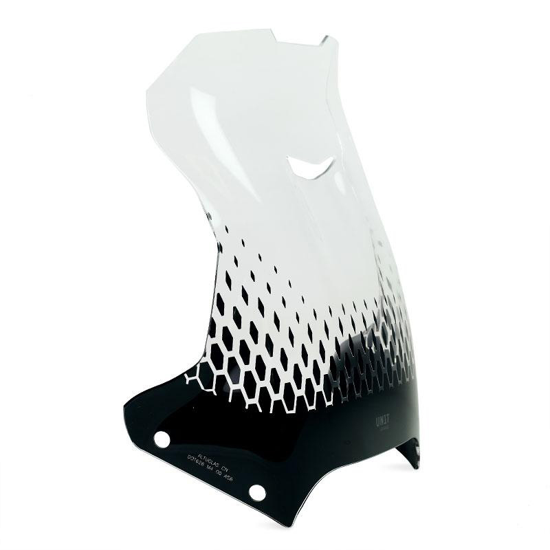 DesertX Edi Touring fairing designed to be mounted without any modification by reusing the original supports. The ergonomics of the fairing is absolutely personal and we have developed it in different shapes, sizes and transparencies, each suitable for different heights and expectations. In this version, the largest and most protective of the three proposals, we have increased the size compared to the original without compromising the design. More protection for those who want to face long journeys and with the addition of a central air intake that directs the air flow in a more controlled way. Trying is believing, the result is fantastic both in terms of design and comfort! Made of 4mm thick PMMA, it is available both transparent and smoked, both with screen printing.