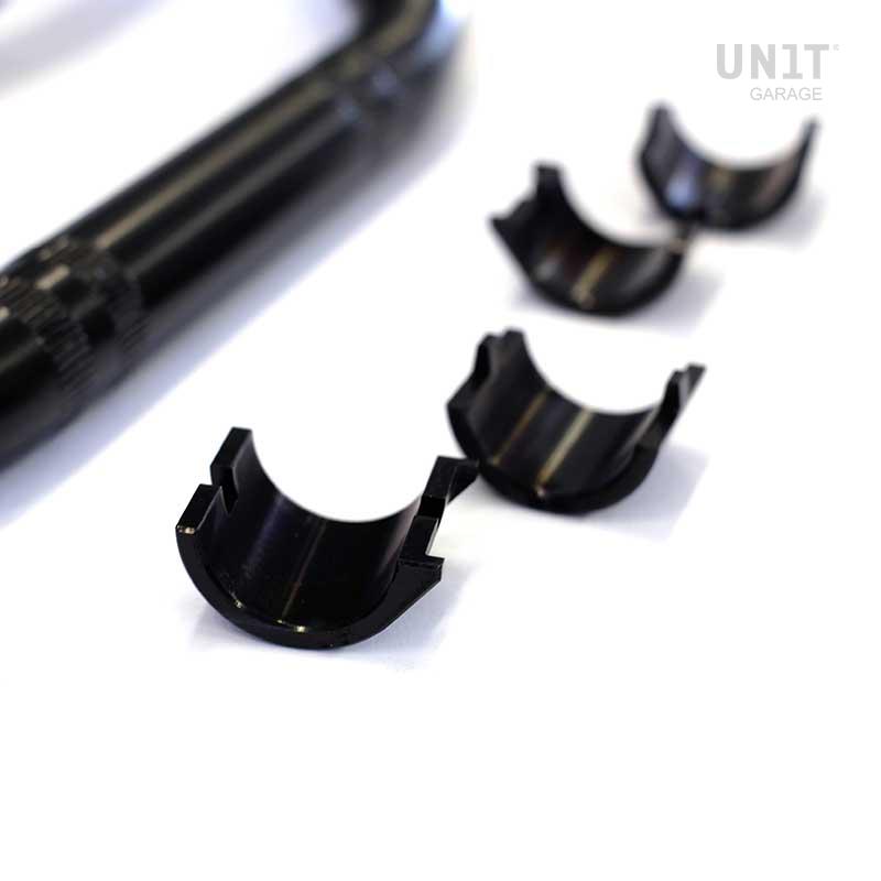 Made of steel with a matt black epoxy powder finish, it comes with everything needed for mounting on the original risers and controls.