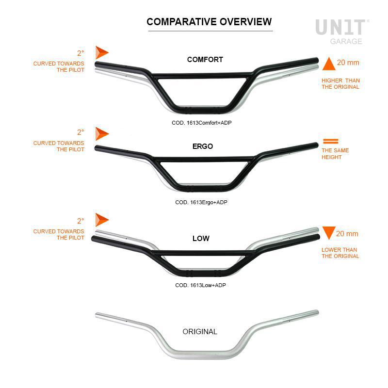 The 1613 low handlebar is lower than the original one and has a more comfortable bend (see measurements in the sheet)