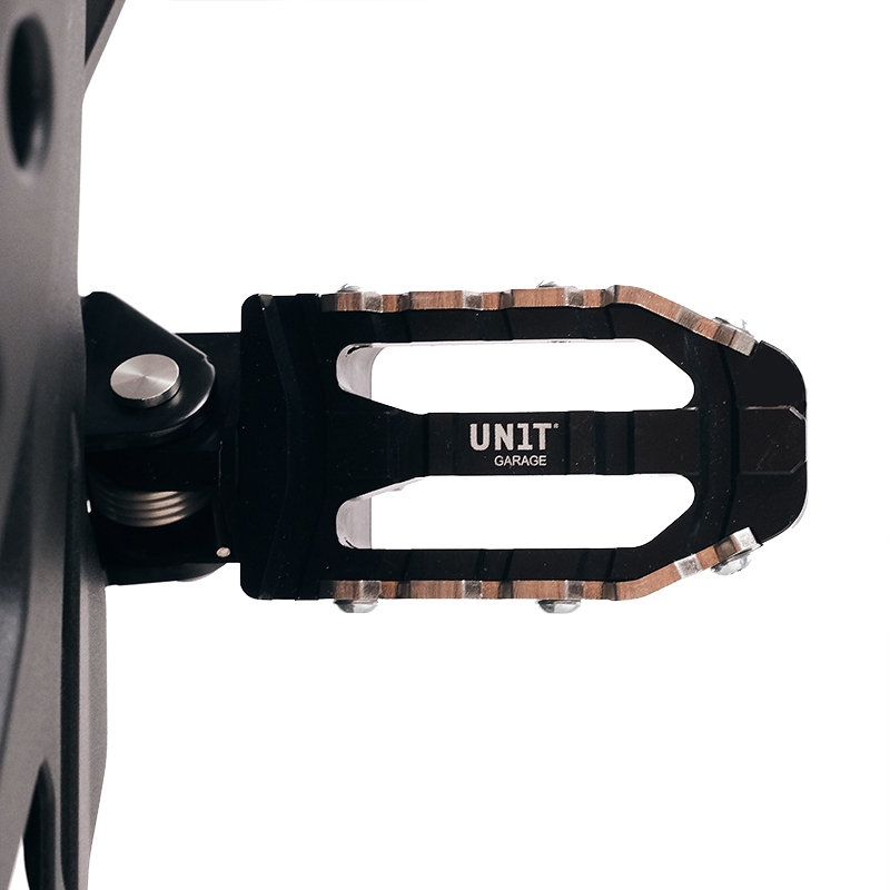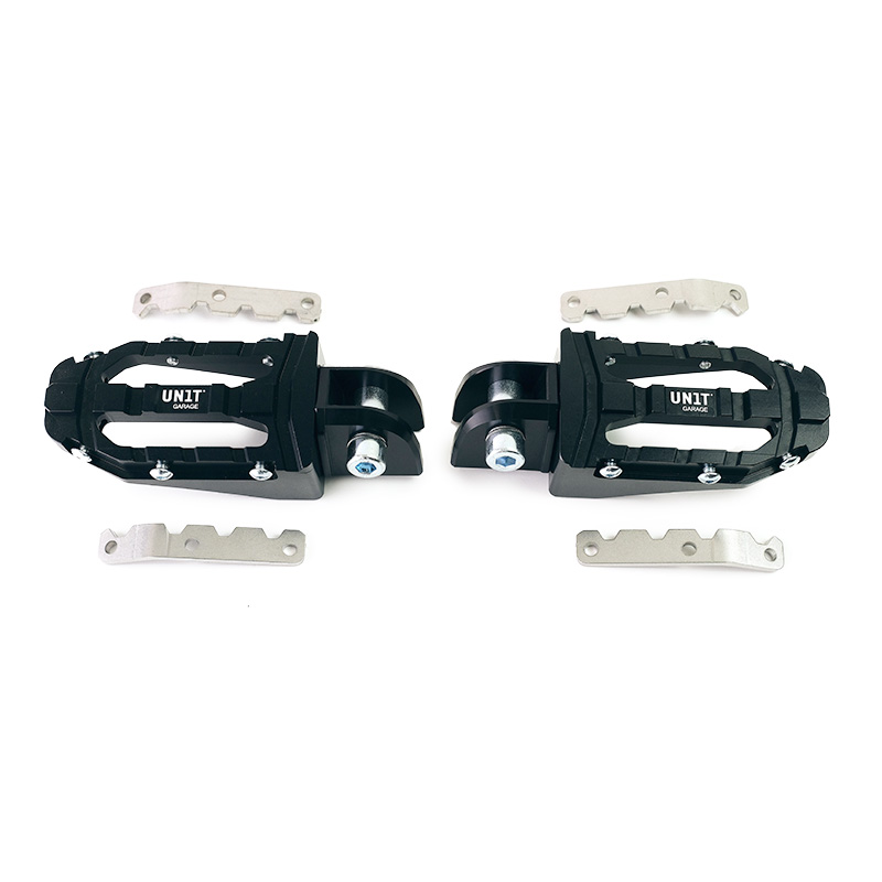 Pair of CNC solid machined footpegs with stainless steel inserts. They greatly improve the boot support when off-road riding, especially when standing, and these footrests can also be adjusted as they can rotate 30 degrees, giving every rider excellent ergonomics.