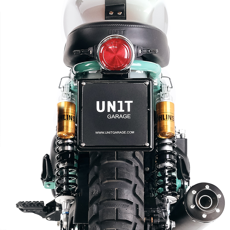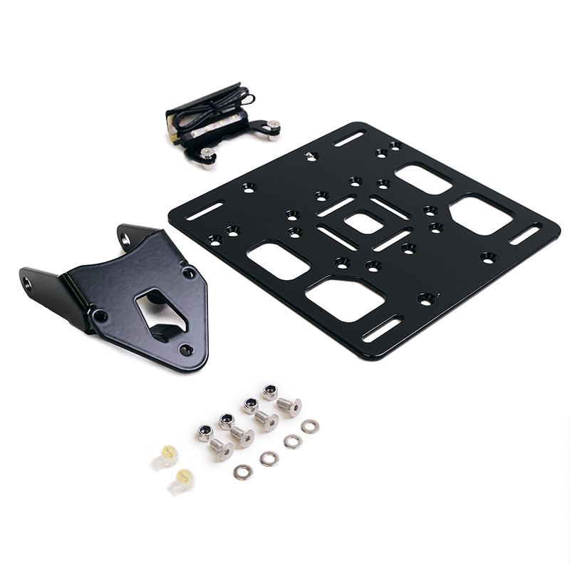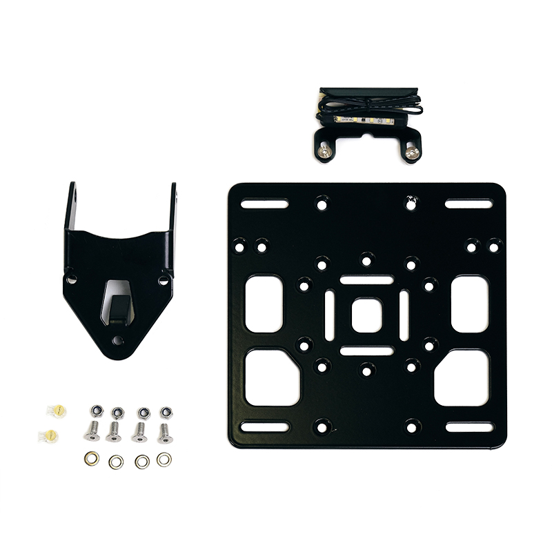 We did not like the back plastic: the result is fantastic! Made of black epoxy powder-coated steel, it is supplied complete with number plate light and bracket. It attaches to the headlight very easily and allows you to significantly change the character and style of the bike at the rear by shortening and raising the number plate. Complete with everything needed for assembly, it is compatible with both our bag and luggage rack frames and original ones.