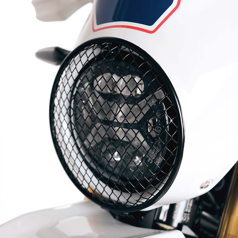 Handcrafted grille in perfect 1980s Dakar style and treated with a high-resistance powder coating, it can be quickly removed to clean the headlight.