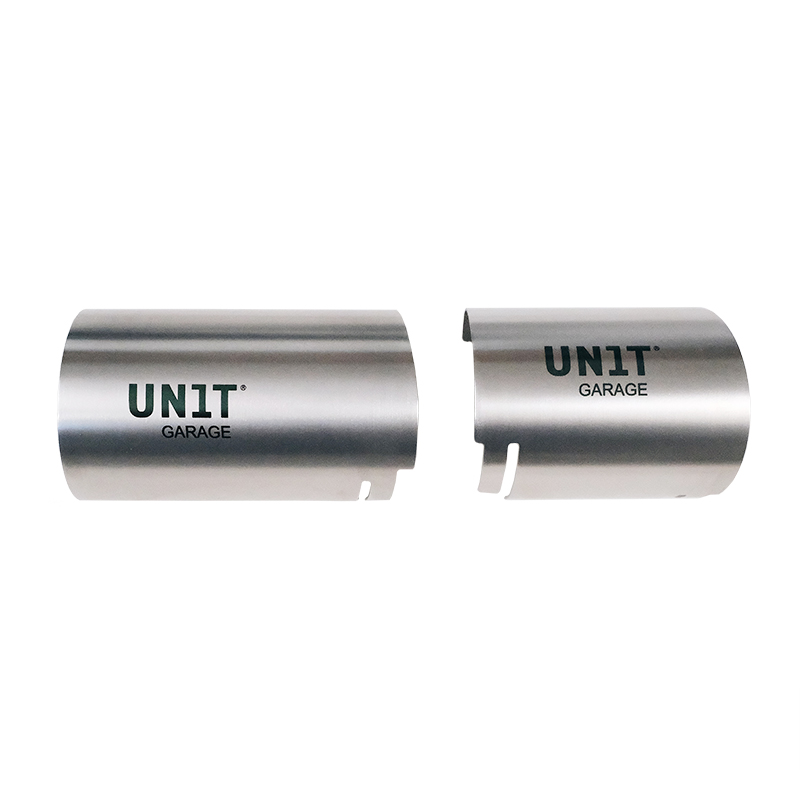 Pair of satin stainless steel intake manifolds, right and left, with Unit garage logo.