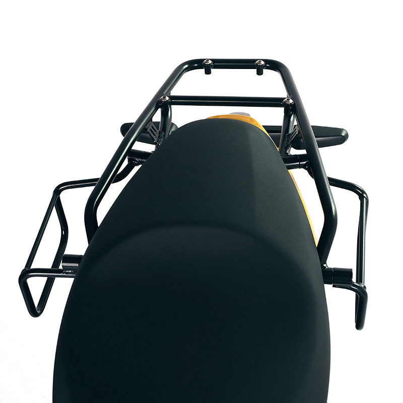 Designed on the Royal Enfield frame, it integrates perfectly with the rest of the motorbike and is made of steel with a matt black epoxy powder-coated finish. Ready to host our quick release system, beautiful and minimal even when the bag is not mounted.